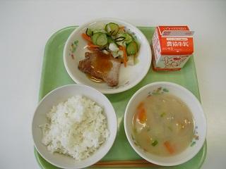 今日の給食。メニューは、ぶた肉のくわ焼き、即席漬け、じゃがいものみそ汁でした。今日もおいしくいただきました。