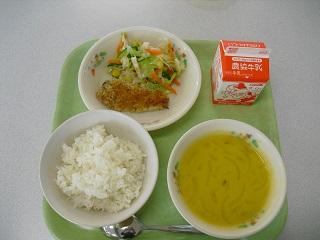 今日の給食は、とびうおの香草パン粉焼き、コールスローサラダ、かぼちゃのポタージュでした。かぼちゃの甘みがすごく出ていて、とてもおいしかったです。