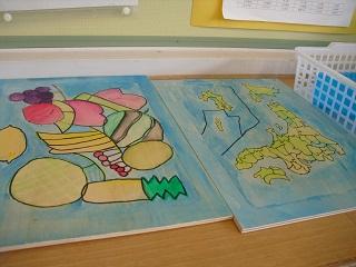 5年生の図工。木のパズルを作っています。これから、パズルになるように糸のこで切っていきます。