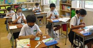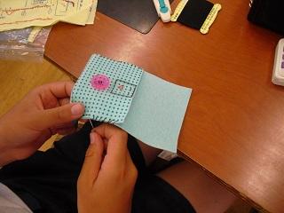 5年生の家庭。ボタン付きの小さな袋をつくっていきます。