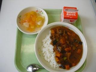 2021年7月2日 13時17分今日は、白山めぐみん給食でした。メニューは夏野菜カレー、フルーツポンチでした。カレーには白山市で栽培された、にんじん、トマト、たまねぎが入っています。その他にも、なす、かぼちゃ、枝豆など野菜がたっぷり入っています。野菜の甘みが出ていて、とてもおいしかったです。