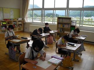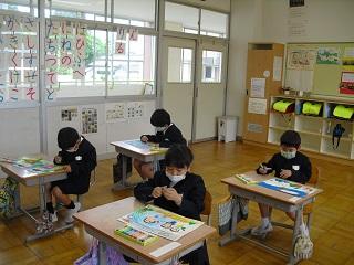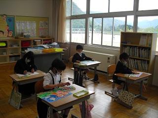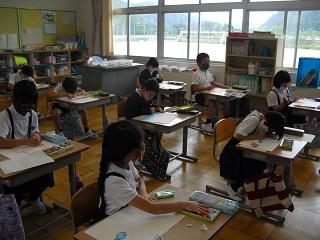 昨日の校外学習の振り返りをしているところです。1年生は絵で楽しかったことを上手に表現していました。3年生は文章と絵で振り返っていました。国語辞典も使って書きます。