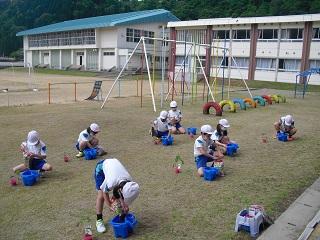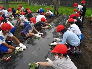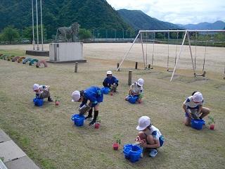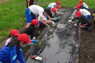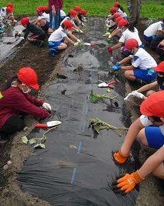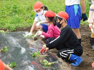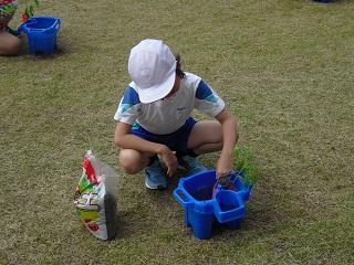 たてわり班で苗を植えます。