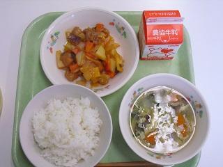 今日の給食。メニューは酢豚、たまごとチンゲンサイのスープでした。今日もおいしくいただきました。