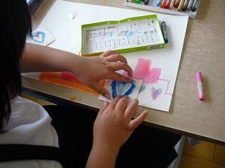 2年生の図工。くれよんをぼかして表現していました。そのままぼかす、型をつくってからぼかすなどいろいろな方法で描いていました。