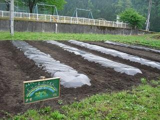 さつまいもの苗を植えるばかりになりました。校務士さんが畑の畝をつくってくれました。ありがとうございます。今日の放課後、先生方でマルチシートをはりました。