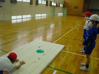 4年生の授業。体育ではマット運動をしていました。マットに緑色の円をおいて、そこにおしりをつけるようにすると後転が上手にできました。1時間の間に上達していました。