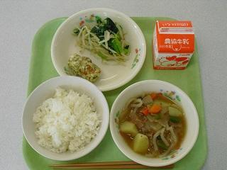 今日の給食は、ちくわチーズ天ぷら、もやしの甘酢和え、新じゃがいものそぼろ煮でした。じゃがいももホクホクしていて、おいしかったです。