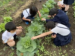3年生の理科。学校の畑のキャベツに、蝶の卵や幼虫がいないか、探しています。
