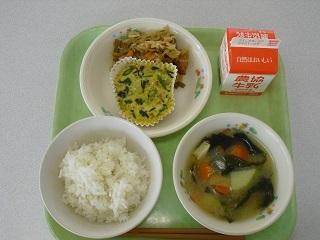 今日の給食は、アスパラの千草焼き、切り干し大根炒り煮、厚揚げのみそ汁でした。千草焼きには、アスパラ、ほうれん草、人参、ひじきなどがたくさん入っていました。今日もおいしくいただきました。