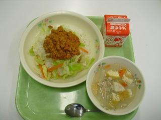 今日の給食は「お祭り給食」でした。今回は沖縄県の「エイサー祭り」にちなんだメニューで、タコライス、イナムドゥチでした。タコライスは「タコス」の具をごはんの上にのせた料理で、沖縄県で生まれた料理です。イナムドゥチは、沖縄県の郷土料理で、豚肉を使った白味噌仕立ての具だくさんのみそ汁です。どちらもおいしかったです。保健給食委員の皆さんが放送でメニューについてお知らせしてくれました。