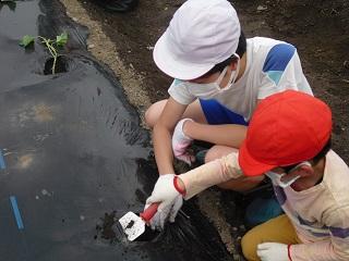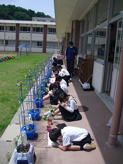 2年生の生活科。ミニトマトの苗を植えていました。大事に育てていきましょう。