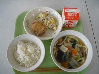 今日の給食。メニューは、とりのから揚げ、ごぼうサラダ、かやくうどんでした。今日もおいしかったです。