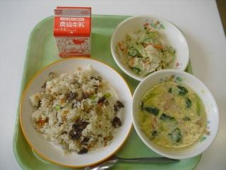 今日の給食です。牛肉とごぼうのピラフ、バンバンジーサラダ、コーンかき玉スープでした。とてもおいしかったです。