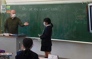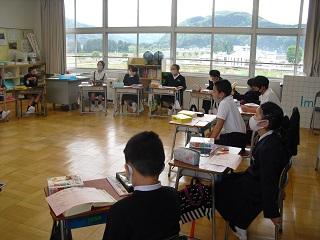 5年生の外国語の授業の様子と学級活動の様子です。学級活動では円になって5月の生活目標について話し合っていました。
