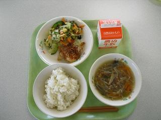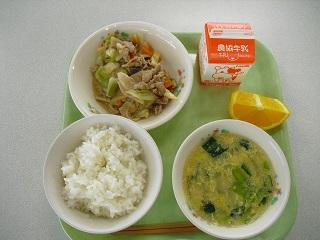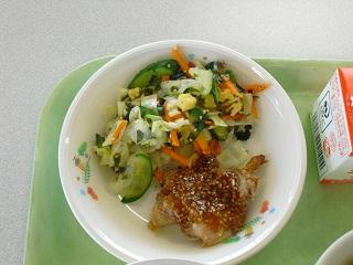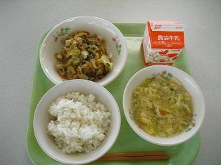 今日の給食。メニューは豚キムチ風炒め、ワンタンとたまごのスープでした。ほどよい辛さの炒め物とやさしい味のスープで、とてもおいしかったです。