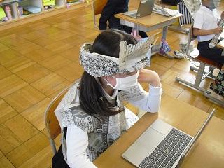 2年生の図工。新聞紙を使って何ができるかを考え、遊んだり、服や冠などをつくったりしていました。つくった作品はGIGA端末で写真を撮って先生のところに送ります。