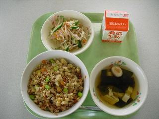 今日の給食。メニューは、たけのこそぼろ丼、もやしとハムの甘酢和え、若竹汁でした。たけのこがたくさん入っていて、春を感じながらいただきました。今日もおいしかったです。