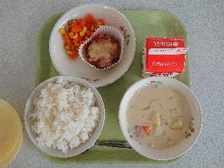 今日の給食。メニューはお豆腐ピザ、にんじんグラッセ、クリームシチューでした。今日もおいしくいただきました。