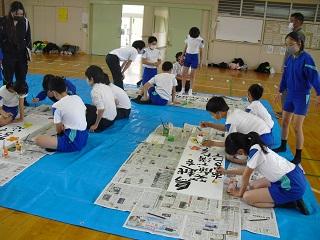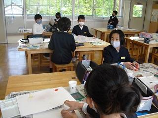 4年生の図工。紙コップやスポンジ、歯ブラシなどに絵の具をつけて思い思いの絵を仕上げていました。