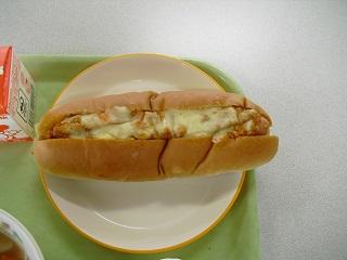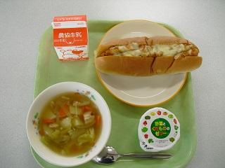 今日の給食。メニューは、チリドッグパン、野菜たっぷりスープ、野菜と果物のゼリーでした。フランクフルトにたっぷりミートソースとチーズがかかっいて、とてもおいしかったです。