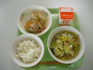 今日の給食。メニューはギョウザ、中華和え、塩ラーメンでした。ラーメンには野菜やあさりなどの具がたくさん入っていました。今日もおいしくいただきました。