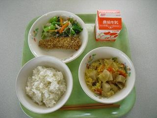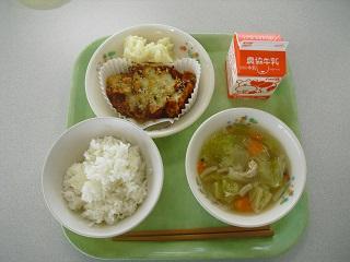 今日の給食。メニューは、いわしのアングレース、はりはり漬け、高野豆腐の卵とじでした。いわしのフライは香ばしいソースの味つけです。卵とじも高野豆腐やくるま麩に味がしみていて、とてもおいしかったです。