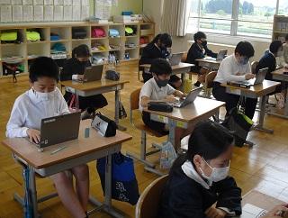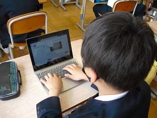 4年生のGIGA端末を使ってのプログラミング学習の様子です。Viscuit(ビスケット)というビジュアルプログラミングで自分の作ったキャラクターを動かす体験をしていました。