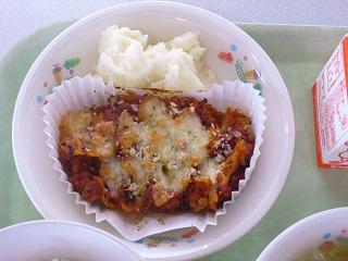 今日の給食。メニューは、大豆ミートグラタン、クリームポテト、コンソメスープでした。ミートグラタンには大豆ミートやレンズ豆が入っていました。今日もおいしくいただきました。