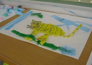 3年生の図工の作品です。「さわってわくわく」という題材です。材料のさわった感じを楽しみながら絵を仕上げました。うまく材料を使って上手に表現していました。