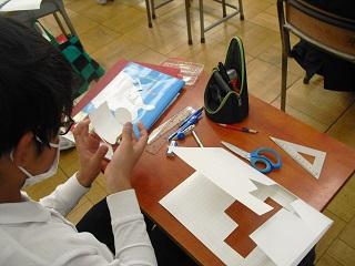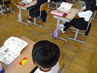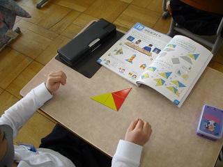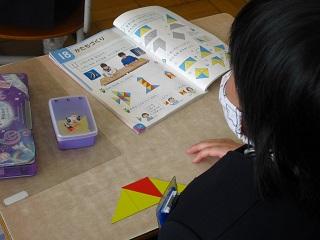 1年生の算数。三角形のカード4枚でいろいろな図形を作っていました。