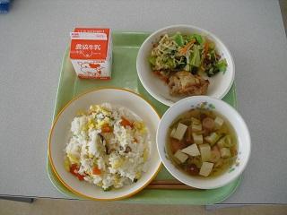 今日の給食。ひな祭りにちなんだメニューでした。ちらしずし、すまし汁、ごま和えです。今日もおいしくいただきました。