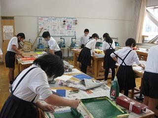 4年生の図工、「ほると出てくる不思議な花」です。今日は背景の色を決めて刷っていました。これからどんな作品ができるのか楽しみです。