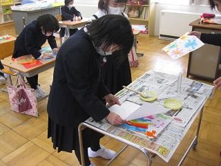 2年生の図工。薄紙をちぎったものを重ねて作品を作っています。
