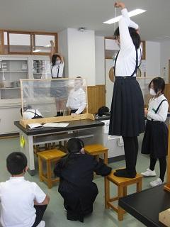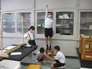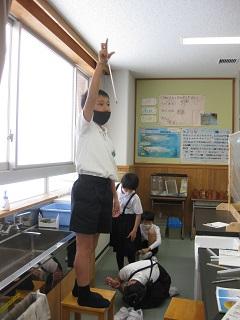 4年生の理科の授業。空気のあたたまり方を調べています。高いところと低いところの温度を測っています。