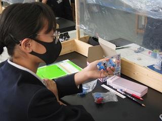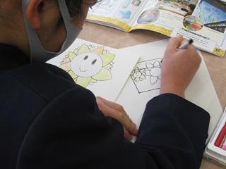 4年生の図工。自分がつくったキャラクターをコップなどにつめて描いていました。大きく描いたり、小さく描いたりしてコップにぎゅっとつめます。