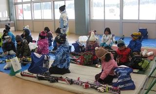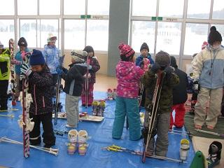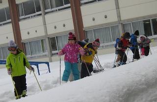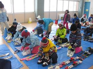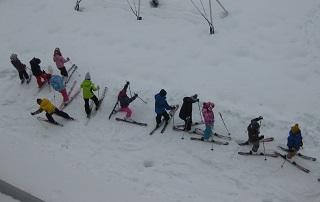 スキー教室の前に1・2年生はスキーの練習をしました。スキー板の置き方、はずし方、くつのはき方などを確認した後、短い時間でしたが外に出て、歩く練習をしました。