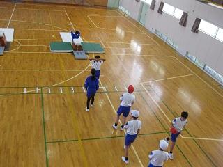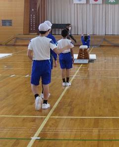 5年生の体育。跳び箱の学習で台上前転をしていました。