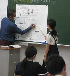 5年生の算数の授業。平行四辺形の面積の求め方を確認していました。