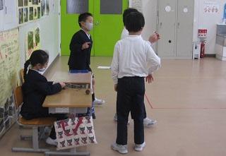 1年生は自分たちがつくった「秋のお店屋さん」に3年生を招待しました。マラカス、やじろべえ、人形、的当て、どんぐりつまみのお店がありました。3年生が楽しんでくれて1年生も喜んでいました。