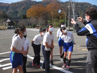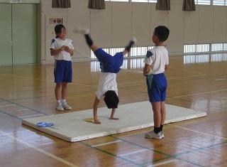 4年生の体育。ゴムをまたいで側転をしているところです。