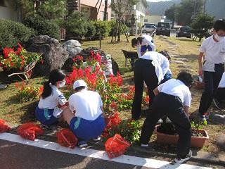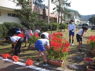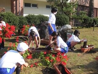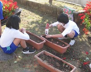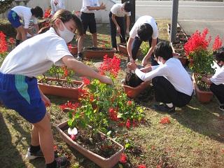 今日の昼休みに6年生が、サルビアのプランターをあけてチューリップの球根を植えました。「今まできれいな花を咲かせてくれて、ありがとう。」と声をかけながらサルビアを抜いていました。球根を植える時も「きれいに咲いてね。」と願いながら植えました。作業をしている様子に気づいた5年生も手伝ってくれました。皆さん、ありがとう。