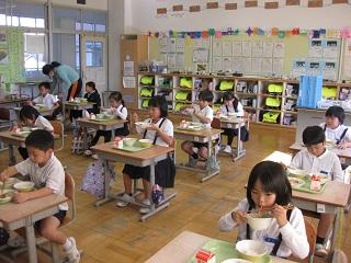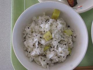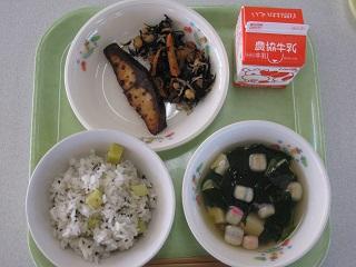 毎年11月24日は「和食の日」です。日本人が昔から食べ、伝えてきた体によい食品の頭文字「ま(まめ)・ご(ごま)・わ(わかめなどの海そう)・や(やさい)・さ(さかな)・し(しいたけなどのきのこ)・い(いも類)」の食材がたくさん使われていました。今日のメニューは、さつまいもおこわ、さかなの白糀焼き、大豆のいそ煮、すまし汁です。おこわに入っているさつまいもは学校の畑でとれたものです。今日もおいしくいただきました。