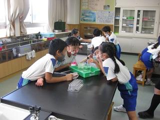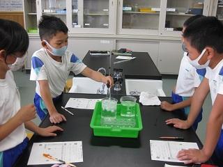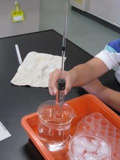4年生の理科です。水の体積は温めたり冷やしたりするとどうなるかを実験で確かめていました。