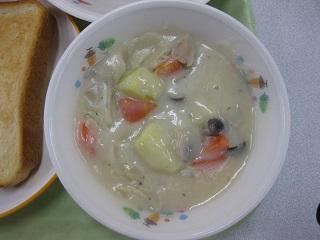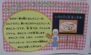 今日の給食は「おはなしからとびだした!りょうり」でした。いわむらかずおさんの「14ひきのあさごはん」というお話に出てくるメニューです。給食では、パンといちごジャム、きのこスープが登場しました。きのこスープには、しめじ、しいたけ、マッシュルーム、エリンギの4種類ものきのこが入っています。そして、さつまいもは学校の畑でとれたものです。今日もおいしくいただきました。