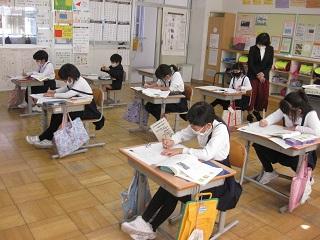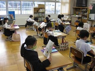6年生の外国語と家庭の授業。家庭では、栄養のバランスを考えて給食のメニューを作成していました。完成したら全校の皆さんにも紹介する予定です。