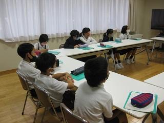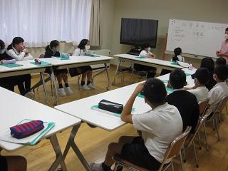 5年生の算数と書写の授業。算数では速さ、時間、道のりの関係について考えていました。