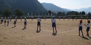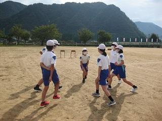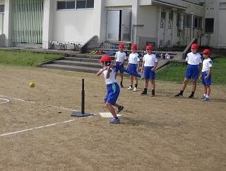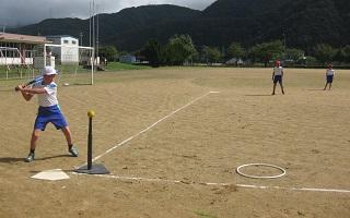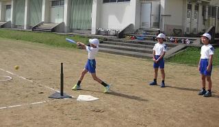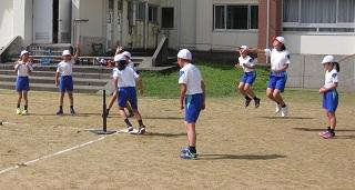 4年生は体育の時間に「ティーボール」をしていました。野球やソフトボールに似ていますが、ティーボールはバッティングティーの上に置いたボールを打ちます。