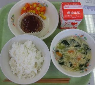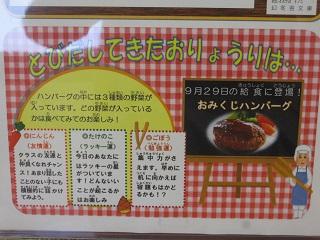 今月の「おはなしからとびだした 料理」は「給食のおにいさん」という本に登場するおみくじハンバーグでした。ハンバーグの中には、にんじん、たけのこ、ごぼうのいずれかが入っています。一つ一つに心を込めて調理員さんが作ってくれました。とてもおいしかったです。