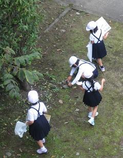 3階から外を見ると1年生が「秋見つけ」をしていました。袋の中には何が入っているのでしょう。